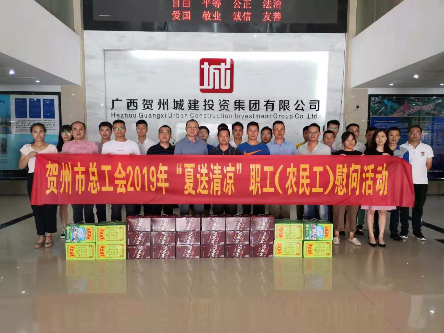 發(fā)布時(shí)間:2019-07-30 作者:文:義潔 圖:莫祖寧 來(lái)源:本站原創(chuàng ) 審核:鄧永劍入夏以來(lái),高溫不斷。為做好防暑降溫工作,切實(shí)保障一線(xiàn)職工身體健康。7月25日,賀州市總工會(huì )經(jīng)審辦主任黃毅與相關(guān)工作人員一行4人深入城投集團,走訪(fǎng)項目一線(xiàn)職工,開(kāi)展“夏送清涼”慰問(wèn)活動(dòng)。城投集團黨委副書(shū)記、工會(huì )主席梁輝露參加慰問(wèn)活動(dòng)。