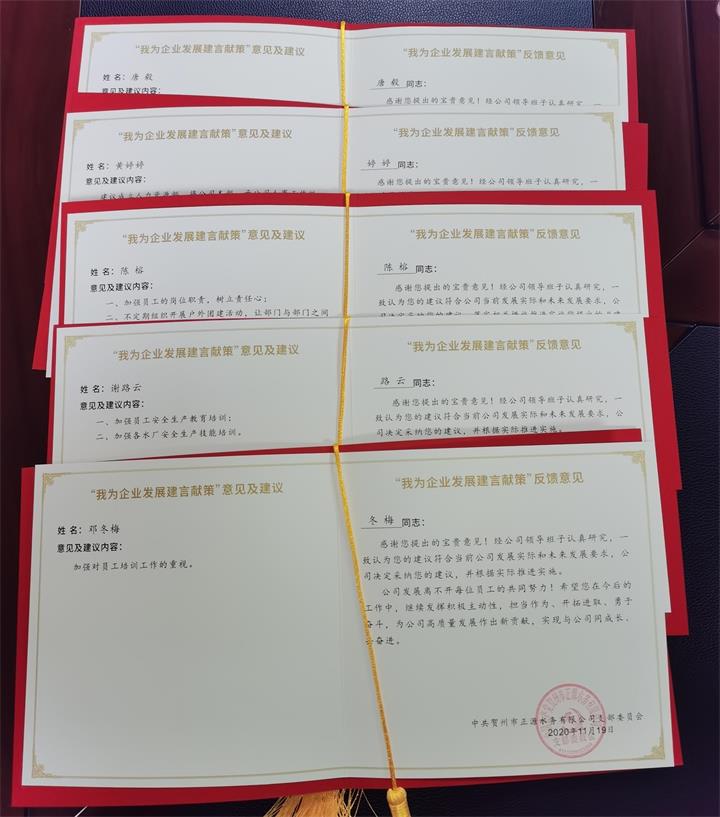 公司班子成員為黨員代表頒發(fā)了“我為企業(yè)發(fā)展建言獻策”反饋卡。此次“建言獻策”活動(dòng)讓員工思考工作,參與管理,基層員工的呼聲能得到發(fā)出和回應,極大提高了員工責任感,激發(fā)了干事創(chuàng )業(yè)的熱情;同時(shí),也為公司謀劃“十四五”工作提出了很多寶貴意見(jiàn),為公司高質(zhì)量發(fā)展奠定基礎。